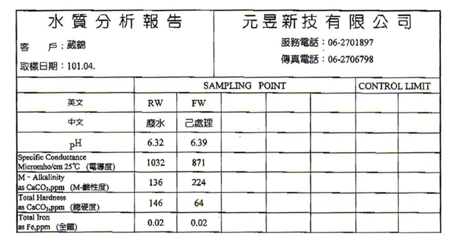 由上表可知,地下水經過剋濾能過濾沉澱後,各項硬度數據值均大幅下降,地下水原水總硬度由Hach 5B測試為1197 ppm 降至 600ppm ,而以ROTEK Hardness劑測試 為1260 PPM也降至 600ppm。