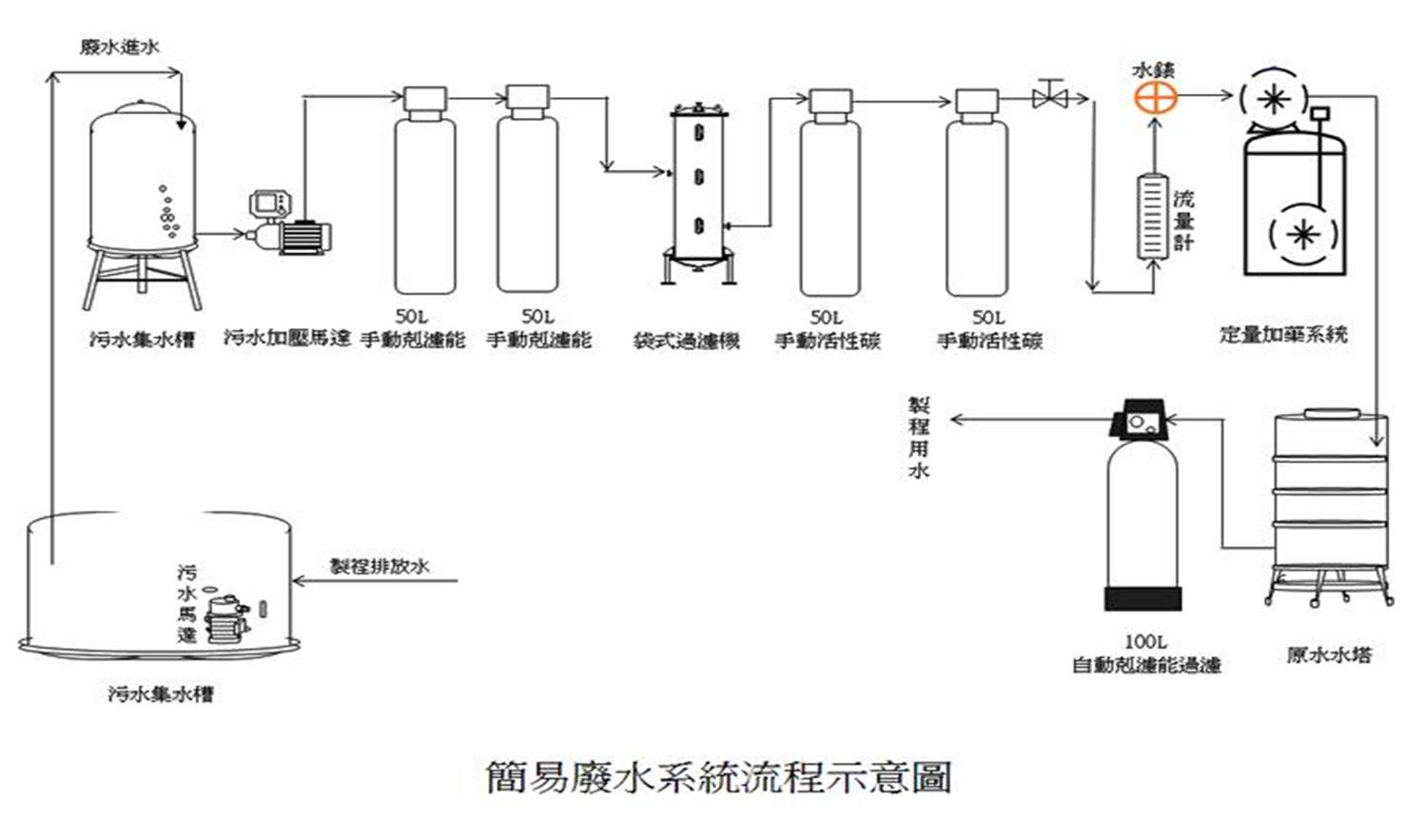 【製麵廠設計之簡易廢水處理系統流程示意圖】