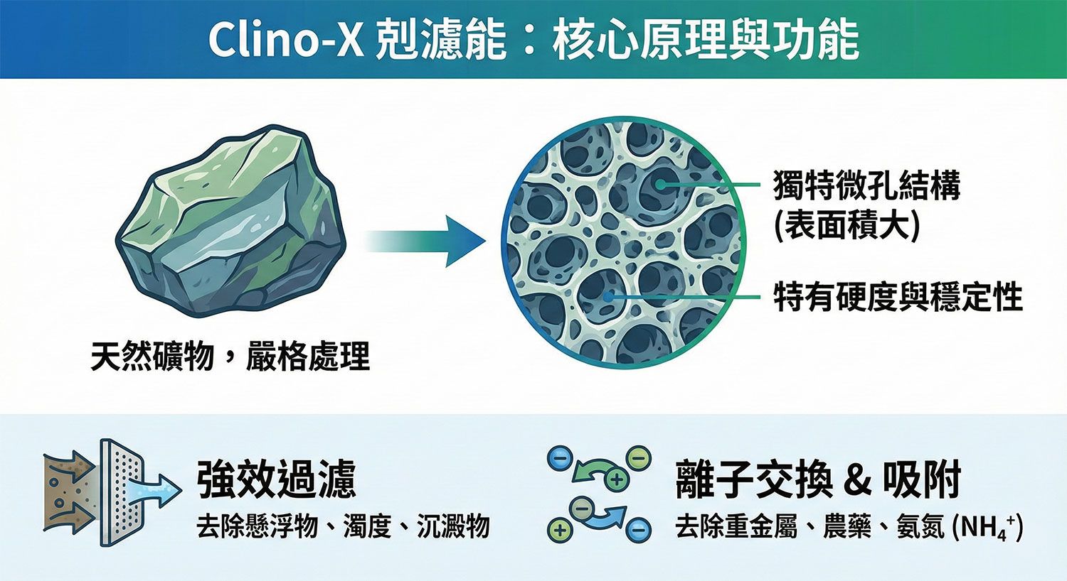 剋濾能濾石是一種稀有的天然礦物,在製造過程中,經過了嚴格的處理與分級後,特有的硬度、穩定性和特殊微孔,無論是使用於水處理或廢水處理,都是種完美的濾料。剋濾能濾石強大的離子吸附和離子交換能力可以去除多種重金屬、農藥、氨氮、懸浮物等,因此可以多元應用在下列各領域,包括:水產養殖的應用、農業土壤改良的應用、畜產的應用、居家環境衛生的應用、水處理、化工方面的應用等等。