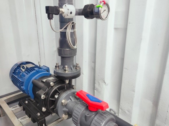 經過袋濾後之海水,以高壓泵浦進入海淡RO膜。因海水鹽分因素、產生淡水所需之逆滲透壓力,由該高壓泵浦提供