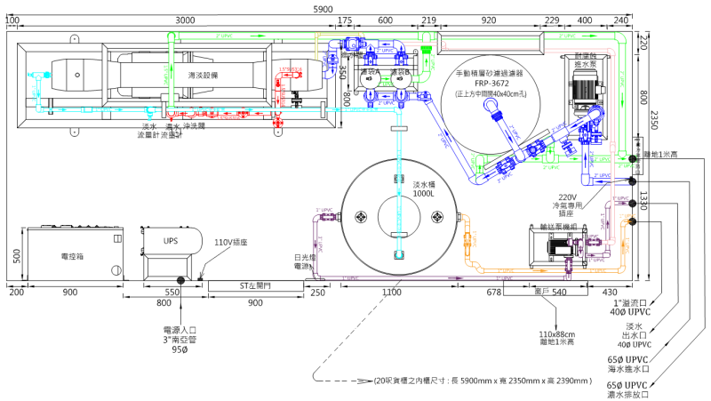 • 脫鹽率:99.5%以上 配管:原水管/產水管/低壓濃水管
