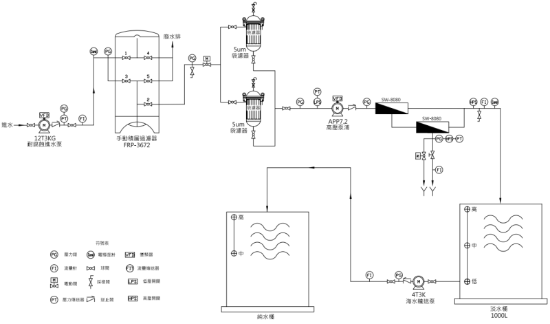 海水進水 → 變頻加壓泵 → 手動砂濾器 → 5μm 袋濾器 → 變頻高壓泵 → SWRO 膜組 → 淡水儲槽(1000L) → 淡水輸送泵